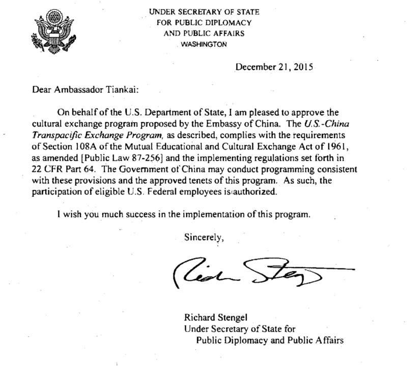 The letter to then-Under Secretary of State for Public Diplomacy and Public Affairs Richard Stengel noted the Chinese Communist Party would “fund all activities of this program”: