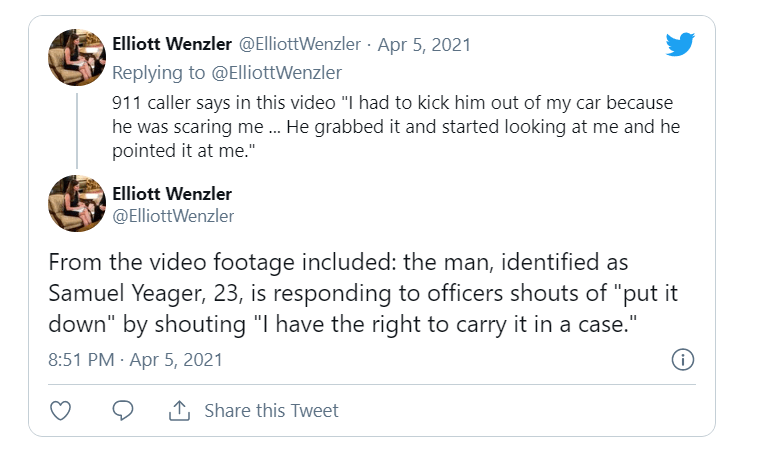 The deputy yelled the suspect multiple time to put down the gun but Yeager ignored him, told him he had a right to have the gun, and walked away with his hand still inside the rifle case.