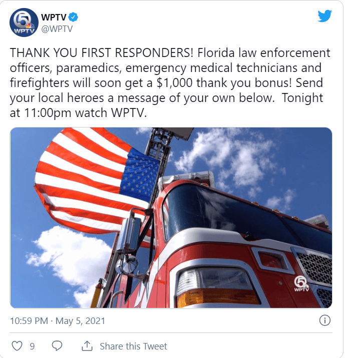 In March, the governor proposed using money from Florida’s federal stimulus package to provide first responders with bonuses, saying they earned the financial boost with their work during the pandemic. The legislature agreed and passed the proposal.