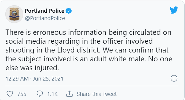 “There is erroneous information being circulated on social media regarding in the officer involved shooting in the Lloyd district. We can confirm that the subject involved is an adult white male. No one else was injured,” tweeted Portland Police.