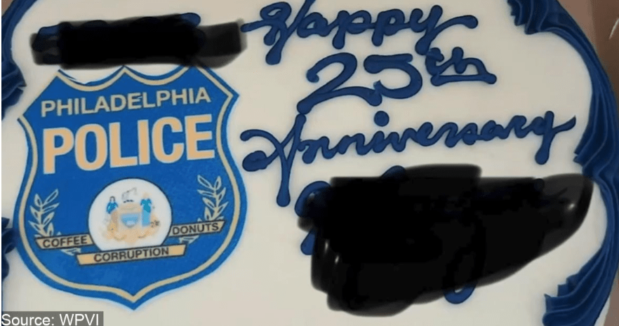 Philadelphia, PA – A Philadelphia Police Department (PPD) employee celebrating his 25th anniversary with the agency was surprised to see the cake a local bakery made to commemorate his achievement was emblazoned with words mocking his profession.