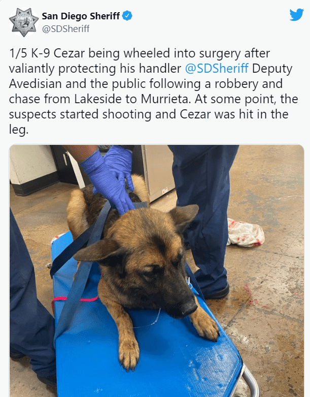 At one point, it appeared the three suspects were trying to carjack another driver, so SDSO Deputy Avedesian released Cezar to stop them. As the dog ran towards the suspects, one person fired a gun and struck the dog in the leg, the sheriff’s department said.
