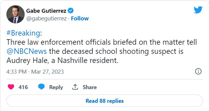 The mass shooter who killed at least 6 people dead Nashville’s Covenant School Monday morning, including 3 children has been identified by police as Audrey Hale.