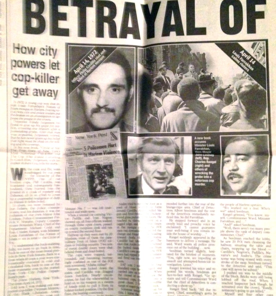 Now Deputy Commissioner Ben Ward arrives, with Farrakhan at his side he shouts to the superior officers that the cops immediately leave the mosque. The crime scene was abandoned. Farrakhan and Rangel are shouting to the superior officers “If you stay, there is nothing we can do to protect you. You’ll be overrun. There’ll be rioting. People may be killed.” Farrakhan and Rangel ‘promise’ that the prisoners would come to the 24 pct. at five o’clock to be questioned. Do you think anyone showed up? Phil Cardillo died six days later. Mayor John Lindsay and Commissioner Pat Murphy did NOT attend the funeral.