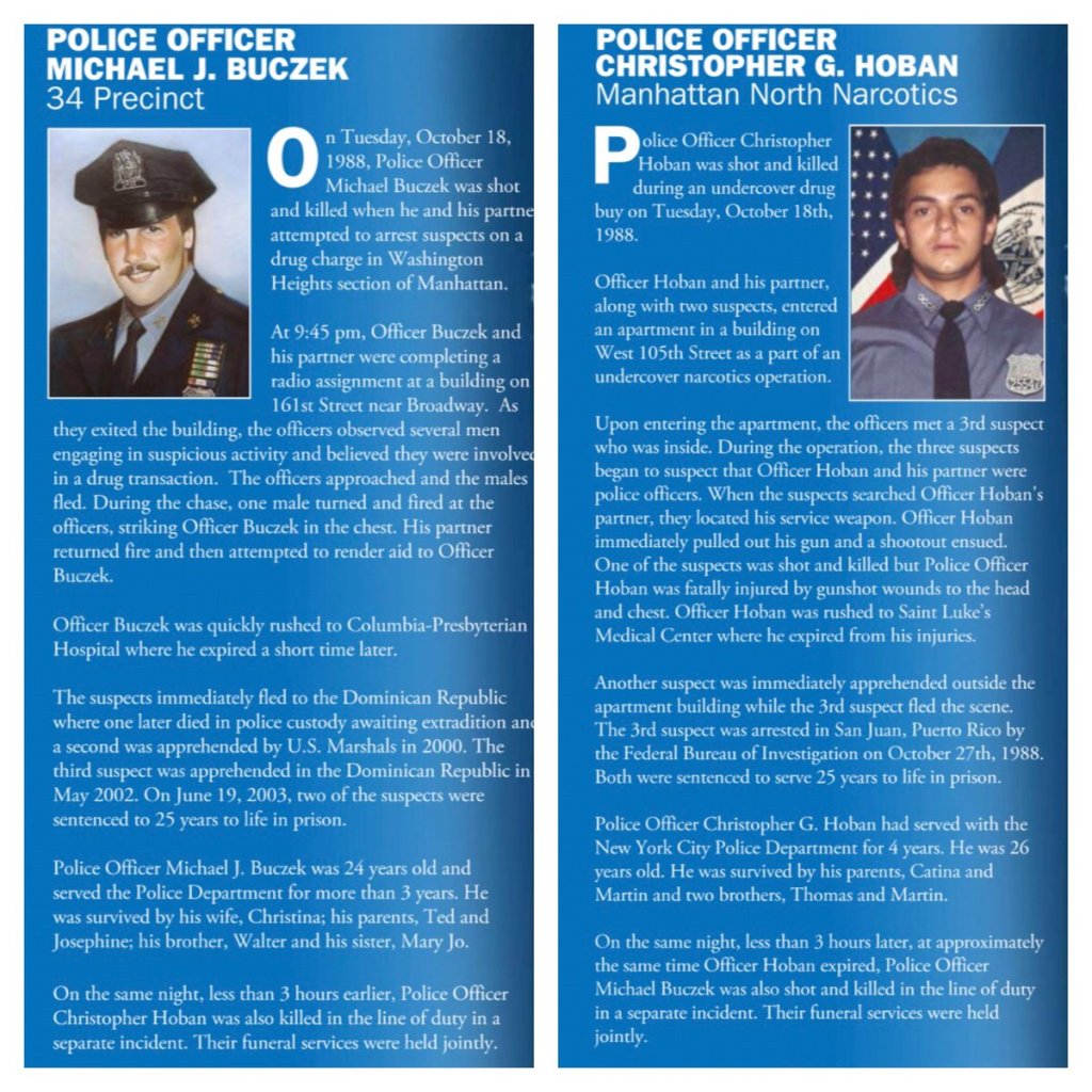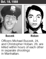 October 18, 1988 was one of the darkest days in the history of New York City; on that day two of New York’s Finest were murdered in unrelated incidents by the drug gangs that then controlled many of the neighborhoods of New York. Officer Chris Hoban was gunned down by drug dealers operating on West 105th Street in Manhattan. Three hours later, Officer Michael Buczek was executed by members of a Dominican drug gang that Buczek and his partner were attempting to drive away from an apartment building where they were selling drugs to kids.