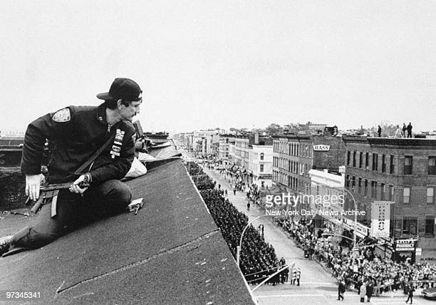 Police officer watches funeral of slain cops Michael Buczek and Christopher Hoban from rooftop near Our Lady of Perpetual Help Church.