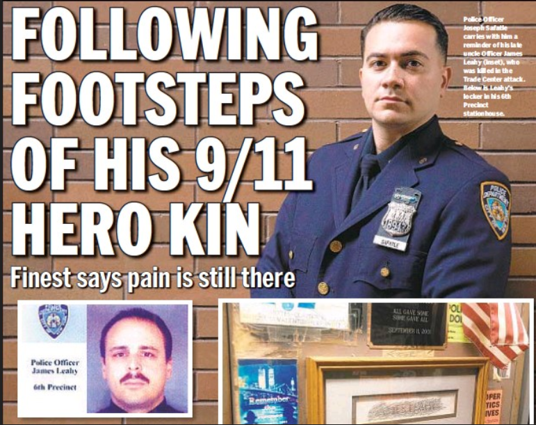 The footsteps taken by his uncle, Officer James Leahy, killed 19 years ago in the rubble of the World Trade Center while ferrying oxygen tanks to firefighters and steering people to safety as the 110-story North Tower collapsed. And a decade later, Safatle following his uncleโs footsteps into a job as a city police officer.