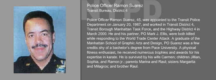 Officer Suarez served the people of NYC at the Delancy Street Subway station, in Transit District 4. He and fellow Officer Mark Ellis, ran from their station to assist in the rescue at the WTC. He was last seen smiling while trying to calm down a woman he had just carried to safety, reassuring her and others that “it was going to be alright”, then headed back into the building.