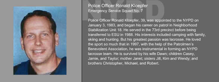 Officer Ronald Kloepfer was killed in the September 11, 2001, terrorist attacks while attempting to rescue the victims trapped in the World Trade Center.