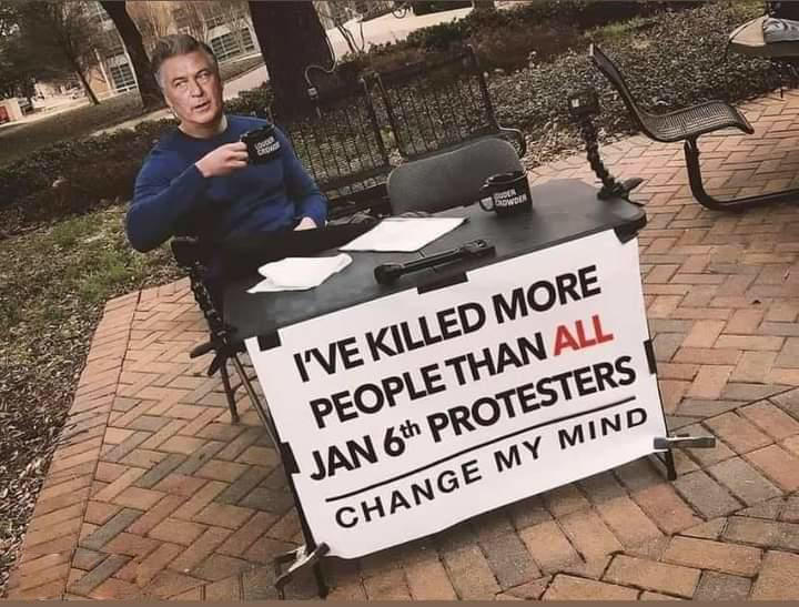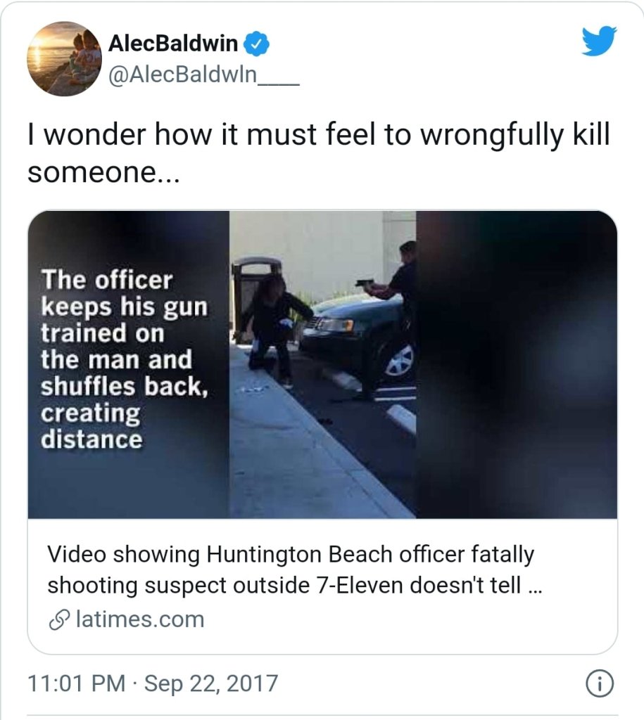 This POS was supposed to be following set gun safety guidelines in the movie industry- HE DIDN’T. Some of the crew had already walked out over these idiots and the horseplay with guns. Instead of following long set safety guidelines, Alex Baldwin pointed a weapon at a colleague and killed her.