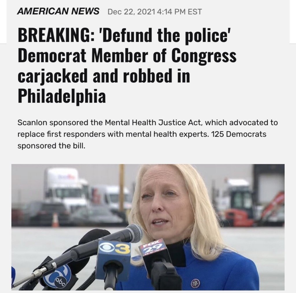 Two Democrats who support police reforms are both CARJACKED just hours apart: Rep. Mary Scanlon is robbed at gunpoint in Philadelphia and Illinois Senator Kimberly Lightford and her husband are carjacked in Chicago