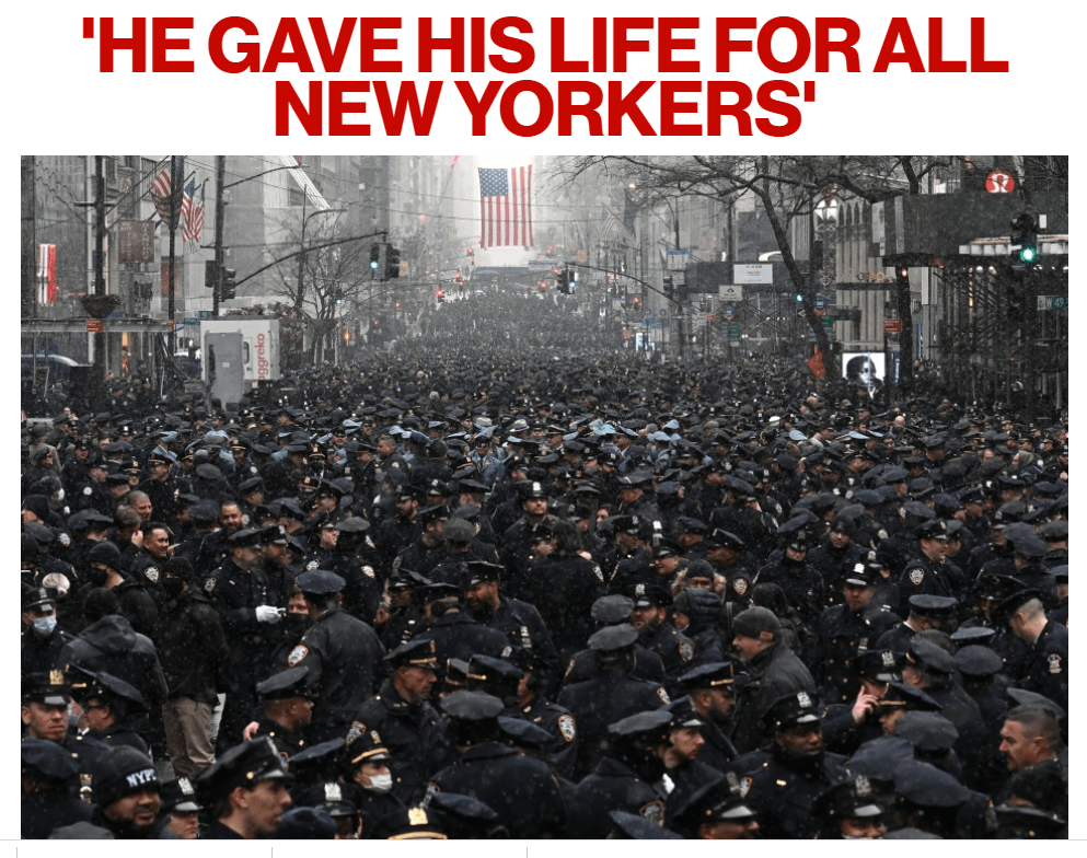 On Friday Officer Rivera’s widow Dominique Luzuriaga spoke at his funeral. She lambasted the dangerous New York City District Attorney Alvin Bragg who allows criminals on the streets to terrorize the city.
